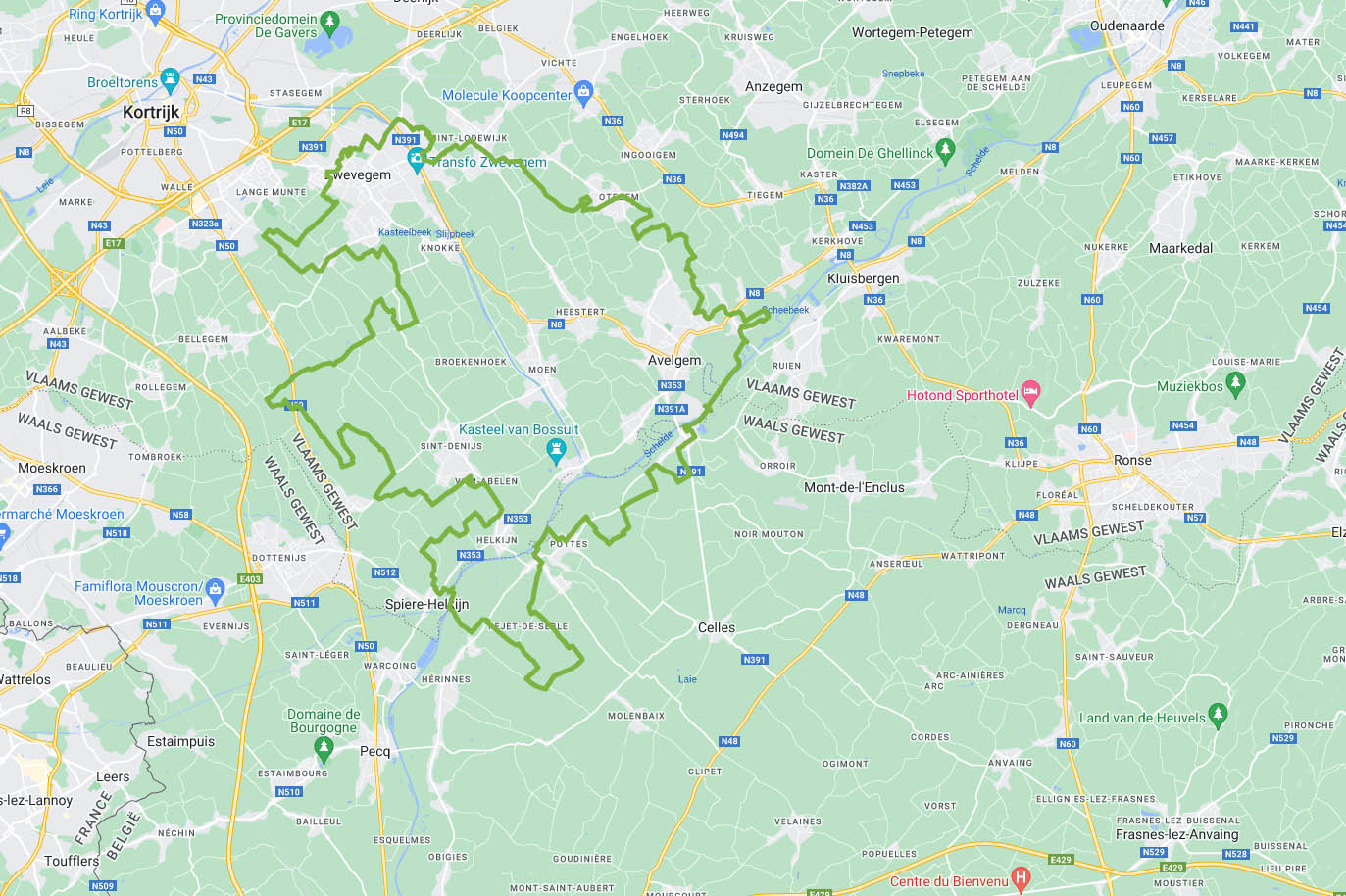 Licht golvend parcours (409 hm) tussen Zwevegem en het voorgeborchte van het Pays des Collines. Langs rustige wegen wachten mooie vergezichten en enkele (beperkte) kuitenbijters.